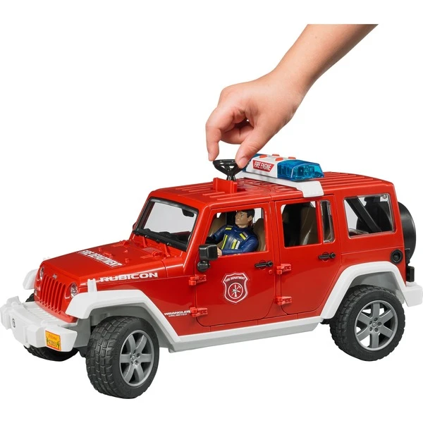 Bei der Koordination von Feuerwehr-Einsätzen, sowie bei kleinen Notfällen wird das Feuerwehr Einsatzfahrzeug benötigt. Durch seine Robustheit und Geländegängigkeit ist der Jeep Wrangler Unlimited Rubicon die ideale Basis für diesen Zweck. Der Leiter vom Dienst in seinem Führungsfahrzeug koordiniert den Einsatz beim Retten von Menschenleben und der Brandbekämpfung und legt aber auch selbst Hand an. Das BRUDER-Modell ist wie das Original, mit geländegängigen, gefederten Achsen ausgestattet. Die Achsschenkellenkung mit Lenkstangenverlängerung durch das Fahrzeugdach ermöglicht das Nachspielen der Einsatzszenen. Türen, Motorhaube und Laderaum lassen sich öffnen und schnell beladen. Die Feuerwehrfigur lässt sich durch beiliegendes Zubehör, wie Feuerlöscher und Funkgerät, ausstatten. Die Einsatz-Lichteinheit mit Sirene auf dem Dach macht den Weg beim Einsatz frei. Neben drei verschiedenen Sirenenlauten kann auch das Motorgeräusch des Fahrzeugs erzeugt werden. So realistisch kann im Kinderzimmer der Feuerwehr-Einsatz nachgespielt werden – „Just like the real thing.“Art.-Nr.: 1338297