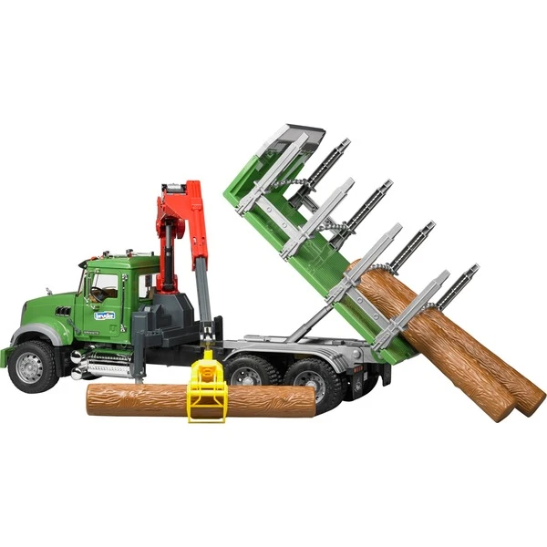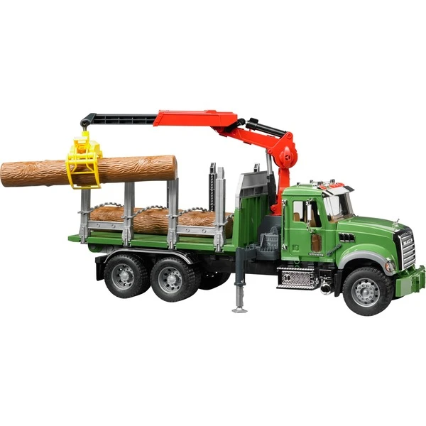 Die Forstwirtschaft erlebt seit Jahren eine Renaissance aufgrund der Gewinnung von nachwachsenden Rohstoffen. Die zahlreichen bruder-Forstfahrzeuge werden durch den neuen MACK Holztranport-LKW ergänzt, um die gewonnenen Rohstoffe über größere Distanzen auf der Straße zu transportieren. Der MACK-LKW zeichnet sich, wie das große Vorbild, durch einen hinter der Führerhauskabine montierten Ladekran aus. Zum Rücken der Holzstämme ist der Ladekran mit einem Holzgreifer ausgestattet, Der Holzgreifer kann in geöffneter Stellung arretiert werden. Wenn ein Holzstamm gegriffen werden soll, wird der Holzgreifer auf diesen abgesenkt und bei mittiger Berührung schließt sich der Greifer automatisch. Ein Beispiel für die Funktionalität dieses LKW´s. Weitere Highlights sind die aus- und absenkbaren Kranstützen, sowie die zur Ladungssicherung dienenden Ketten an den Rungen der Ladeplattform. Selbstverständlich können auch zur seitlichen Verladung des Holzes die Rungen herunter geklappt werden. Rückwärtig kann der LKW durch kippen der Ladeplattform entladen werden.Art.-Nr.: 1429210
