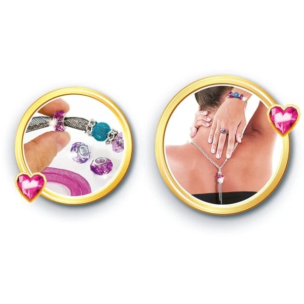 | Inhalt/Ausstattung | Kunststofftasche zum Zusammenbauen, herzförmige Dose, Perlen in verschiedenen Formen und Farben, Karabiner, Verschlüsse, PVC-Schlauchbänder, Band, Kettchen, Ringe, Abstandselemente-Anhänger, Aufkleber, Anleitung | ||