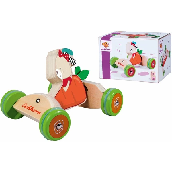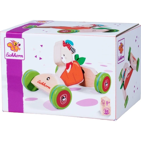 Das Schiebefahrzeug von Eichhorn ist aus FSC-zertifiziertem Birkenholz gefertigt und auch für kleine Babyhände gut zu greifen. Es ist etwa 16 Zentimeter lang und besitzt eine Schwenkfunktion, durch die es auch gelenkt werden kann. Das niedliche Hasen-Karotten-Motiv sorgt für besonderen Spielspaß. Die Reifen aus Silikon sind geräuschlos und hinterlassen keine Spuren. Art.-Nr.: 1915499