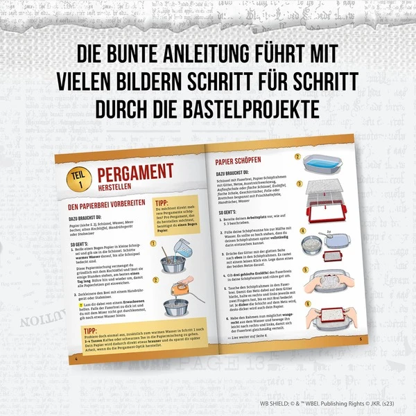 Mit dieser AllesKönner-Kiste stellen Kinder ab acht Jahren Pergamente und Siegel ganz einfach zu Hause her: Mit dem handlichen Rahmen schöpfen sie Papier und basteln damit weiter. Besonderes Highlight für Harry Potter-Fans: Mit dem originalgetreuen Hogwarts-Wappen und der kinderfreundlichen Siegelmasse werden geheime Briefe, offizielle Dokumente oder Grußkarten versiegelt! Ob sie Tom Riddles Tagebuch oder einen eigenen Heuler nachbasteln – hier warten viele magische Bastelprojekte für kleine und große Fans der Wizarding World.