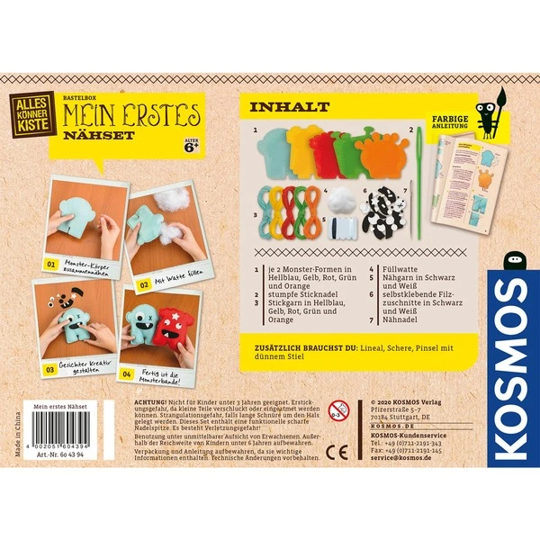 Monstermäßiger Näh-Spaß! Die Knuddelmonster sind los! Mit der „AllesKönnerKiste Mein erstes Nähset“ nähen Kinder ab 6 Jahren Schritt für Schritt ihre ersten Figuren aus robustem Filz. Einfach der Anleitung folgen und die vorgestanzten Filzformen mit stumpfer Nadel und dickem Garn verbinden. Mit Füllwatte füllen und zum Schluss nach Lust und Laune mit den selbstklebenden Filz-Verzierungen gestalten. Ein wunderbares Set, mit dem von der ersten Naht bis zum individuellen Gestalten einfach alles gelingt! Kleine Monsternäher können gleichzeitig kreativ sein und ihre Feinmotorik verbessern. Erfolgserlebnisse sind sichergestellt, wenn sie ihr erstes Monsterchen selbstgenäht haben. Perfekt für kreative Bastelnachmittage mit Freunden!Art.-Nr.: 1618904
