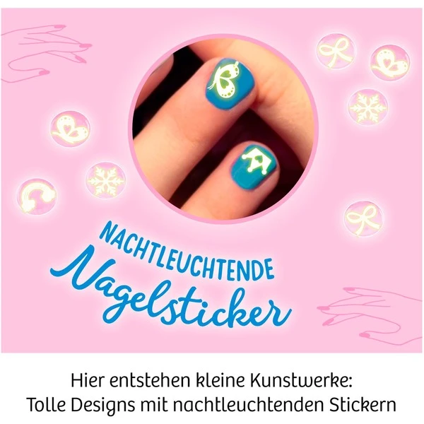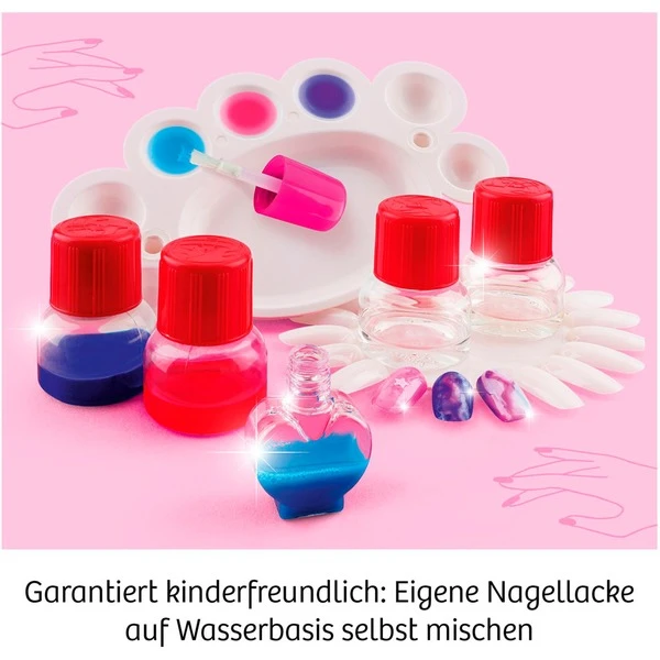 Die Fingernägel glänzen in rosa und blau – mit dem eigenen, individuellen Nagellack! Der wird mit diesem Set ganz einfach selbst hergestellt. Mit der Mischpallette werden aus zwei Basisfarben ganz individuelle Kombinationen erstellt und das schönste Ergebnis kann in einem herzförmigen Flakon aufbewahrt werden. Die enthaltenen Lacke bestehen alle auf Wasserbasis, womit sie immer angenehm riechen und leicht zu entfernen sind. Wie bei den Profis können kreative Muster erst auf dem ebenfalls enthaltenen Nagelrondell geübt werden. Oder doch lieber die Zehennägel verschönern? Mit dem praktischen Zehenspreizer kein Problem. Zu echten Hinguckern werden die Nägel spätestens mit im Dunkeln leuchtenden Nagel-Stickern.Art.-Nr.: 1848329