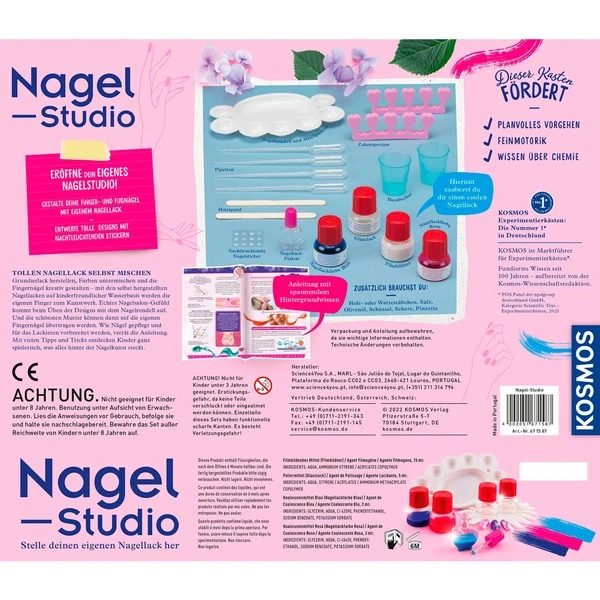 | Hinweis | Inhaltsstoffe der in diesem Produkt enthaltenen Flüssigkeiten: Filmbildendes Mittel (Filmbildner), 15 ml Aqua, Ammonium Styrene/ Acrylates Copolymer. Poliermittel (Glanzlack), 5 ml: Wasser, Styrene, Acrylates, Ammonium Methacrylate Copolymer. Koaleszensmittel Blau (Nagellackfarbe Blau), 3 ml: Glycerin, Wasser, CI 42090, Phenoxyethanol, Sodium Benzoate, Potassium Sorbate. Koaleszensmittel Rosa (Nagellackfarbe Rosa), 3 ml: Glycerin, Wasser CI 45410, Phenoxyethanol, Sodium Benzoate, Potassium Sorbate. | ||