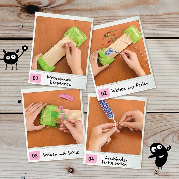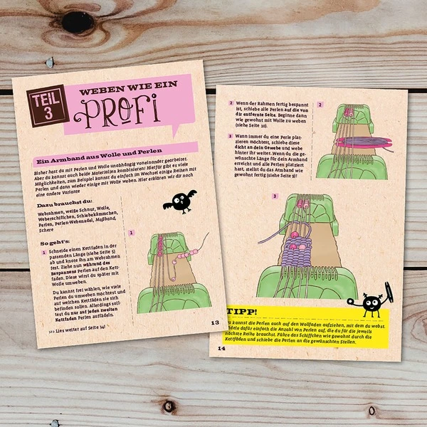 | Inhalt/Ausstattung | Webrahmen für Perlen und Wolle, Zubehör zum Weben, Wolle in lila und grün, bunte Kunststoffperlen, stumpfe Nadel, Anleitung (16 Seiten) | ||
