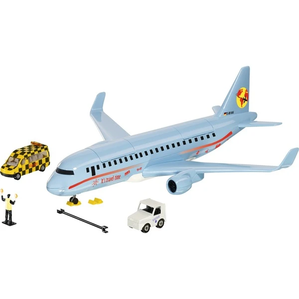 Das große SIKU WORLD Verkehrsflugzeug (38,5 cm) mit den zwei mächtigen Triebwerken steht zum Einsteigen bereit. Doch wer sitzt wo? Das Kabinenpersonal kann einfach die vordere Klappe im Dach anheben und die vier Passagiere ihre Plätzen zuweisen. In der hinteren Klappe ist Platz im Laderaum für das Lieblingsauto, das mit in den Urlaub genommen werden kann. Voller Schub, der Flieger wird schneller und schneller, hebt ab und das Fahrwerk kann eingeklappt werden. Bereit machen zum Landeanflug: Fahrwerk ausklappen und den Landescheinwerfer anmachen. Die LED geht nach zehn Minuten Betriebszeit automatisch aus. Das Flugzeug ist gelandet. Das Follow-me-Fahrzeug begleitet das Flugzeug zur Parkposition. Der Flugzeugschlepper mit der Schleppstange stehen schon für den nächsten Abflug bereit. Art.-Nr.: 1524964