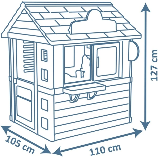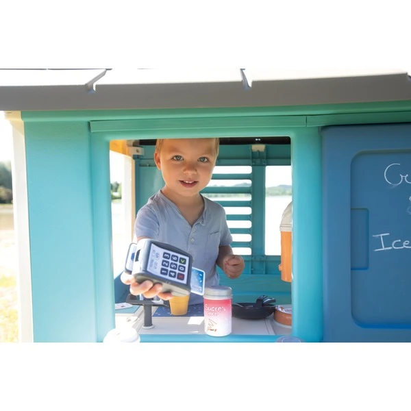 | Inhalt/Ausstattung | Spielhaus mit zwei Fenstern, Eingangstüre, Verkaufstheke, Eismaschine, Herdplatte, einem Teller, ein Besteckset mit Gabel, Messer und Löffel, einen Take-Away Kaffeebecher, Pfannkuchenpfanne mit Wendefunktion, 2 Pfannkuchen, Zuckerdose, Streuseldose, 2 Eiskugeln und Waffeln sowie 4 Kassenbelege, Kleingeldfach, Kreditkartenlesegerät und Kreditkarte. | ||
